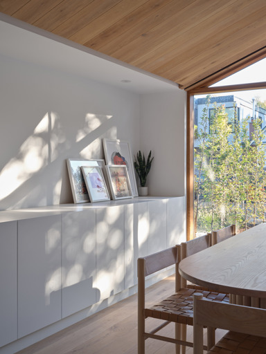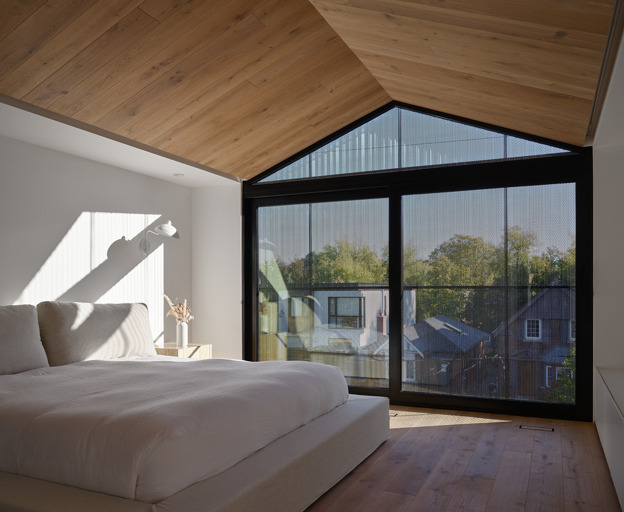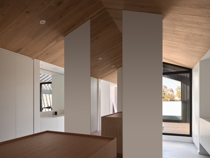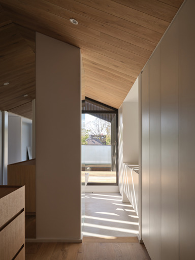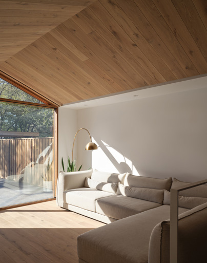 Üçgen çatı "ev"in en önemli simgelerinden biri olsa da mimarlık ofisi bu olguyu motifin ötesine taşıyarak proje boyunca bir anlatı tanımlayan mekansal bir deneyime dönüştürmekle ilgilenmiş.