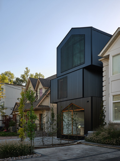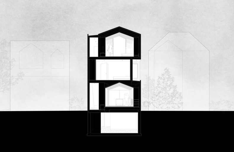 Bunun sonucunda, iç mekanda "ev" motifini taşıyan, üst üste yığılmış kutular gibi okunan üç katlı bir form ortaya çıkmış.