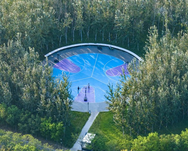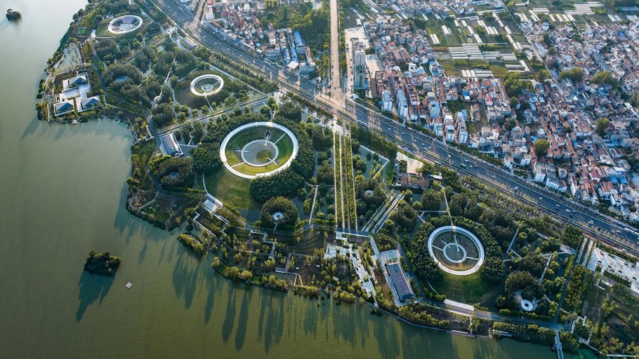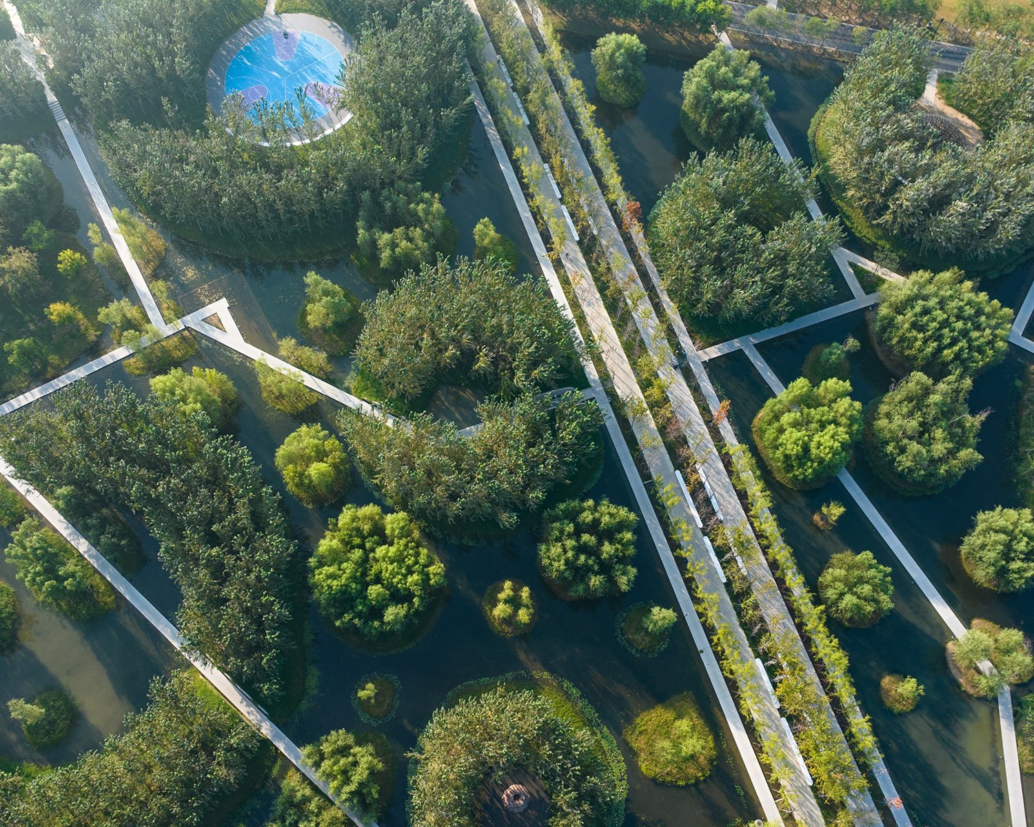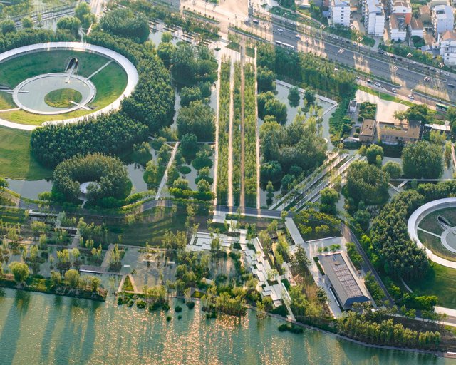 Çok yönlü meydan okumaları ele almak için tasarım stratejisi, suya dayanıklı sünger peyzajı gibi yenilikçi çözümler sunuyor. Sahadan çıkan 860.000 m³ toprak ve moloz, taşkınlara dayanıklı bitkilerle kaplanmış ve 1 milyon m³ yağmur suyunu düzenleyebilen adalar oluşturmak için geri dönüştürülüyor. Tasarım, antik takımyıldızı haritalarının karmaşık düzenlerinden esinlenerek evrenin incelikli güzelliğini yansıtıyor.