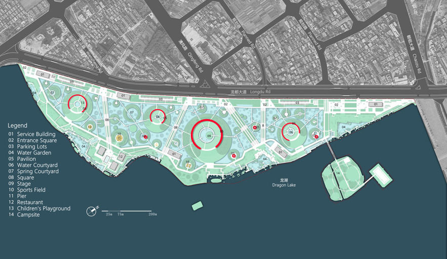 Tarih boyunca Sarı Nehir taşkınlarının etkisi altında kalan Huaiyang, özellikle Dragon Lake ile, yüzyıllar boyunca uyum ve dayanıklılık geliştirmiş bir peyzaj sunuyor. Ancak son yıllarda yaşanan kentleşme, gölün taşkın yönetim kapasitesini azaltarak bölgenin kültürel mirasını tehdit ediyor. Buna yanıt olarak, 430.000 m²’lik alanın geri kazanılması ve taşkın direncini artıran, topluluk ihtiyaçlarını karşılayan ve bölgenin zengin tarihini kutlayan bir kamusal park vizyonu ortaya konuyor.
